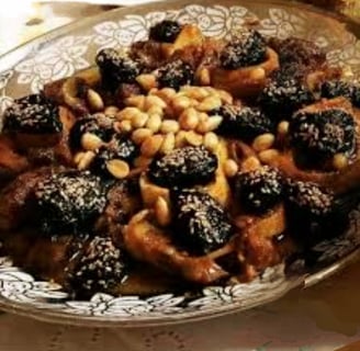 Step 6: Finally, taste the dish and adjust the salt as needed. For elegant presentation, serve it in a round dish, place the meat and a little broth, place the sweet plums in the middle, garnish with almonds and sprinkle with sesame seeds.