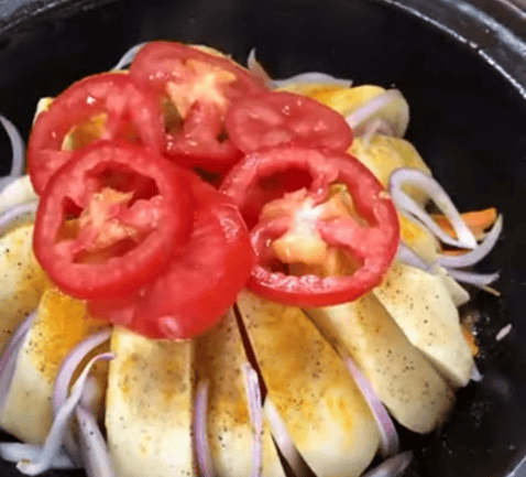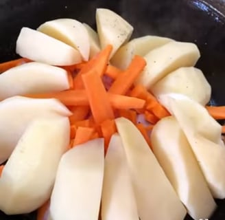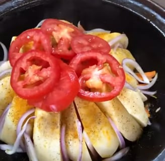 On the fire, in an earthenware pot, put the grated onion and garlic; a little oil; chicken, then add the spices and cover for a moment until the steam comes out, then add the peeled and cut vegetables, the carrots first, then the potatoes, as shown in the photo, sprinkle the rest of the spices and add the tomatoes cut into slices. Add very hot water on top so that the dish does not break, and leave on low heat. Before turning it off, add chopped parsley and olive oil on top.