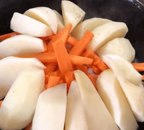 2 potatoes, 2 carrots, 1 tomato, 1 onion, 2 cloves of garlic