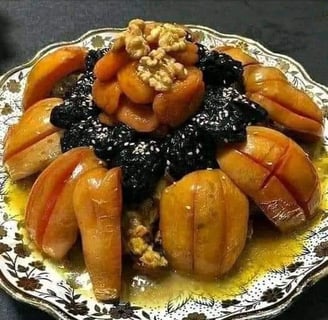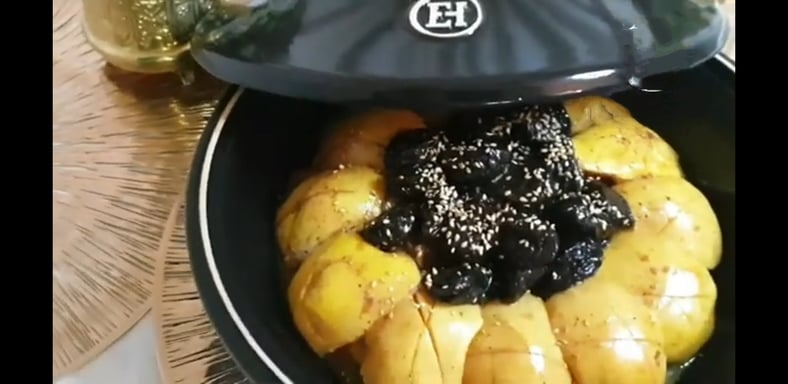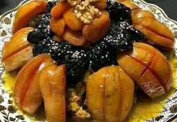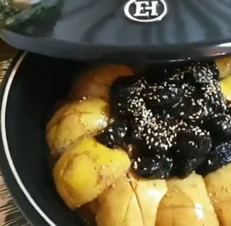 In a serving dish, place the meat in the middle and the quince on the sides. Garnish with candied prunes, sprinkle with sesame seeds and serve {see photo}. Enjoy this delicious and aromatic dish that beautifully balances sweet and salty elements, embodying the essence of Moroccan cuisine.
