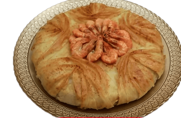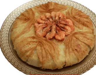 - Put the mixture in the middle and brush the sides with butter and egg whites, then put it on the filling. After gathering the sides, put another sheet in the middle and four on the sides again, then gather the edges so that the filling does not come out. - Brush it with a little melted butter and pierce it with a toothpick so that it does not puff up when cooking. - Put it in the oven at 180 degrees for an hour and 45 minutes or until it is cooked and browned as shown in the picture. Decorate it with shrimp and serve it hot.